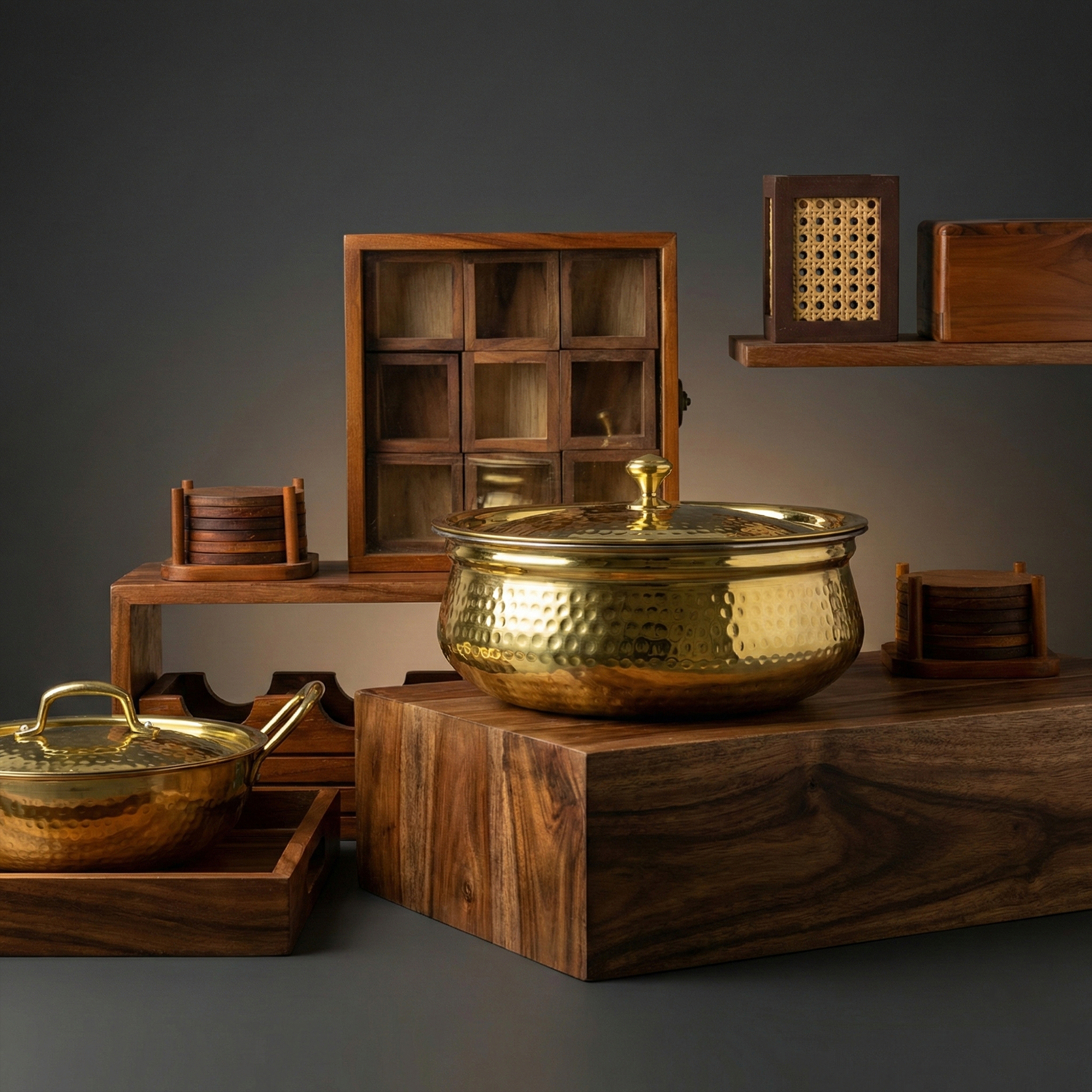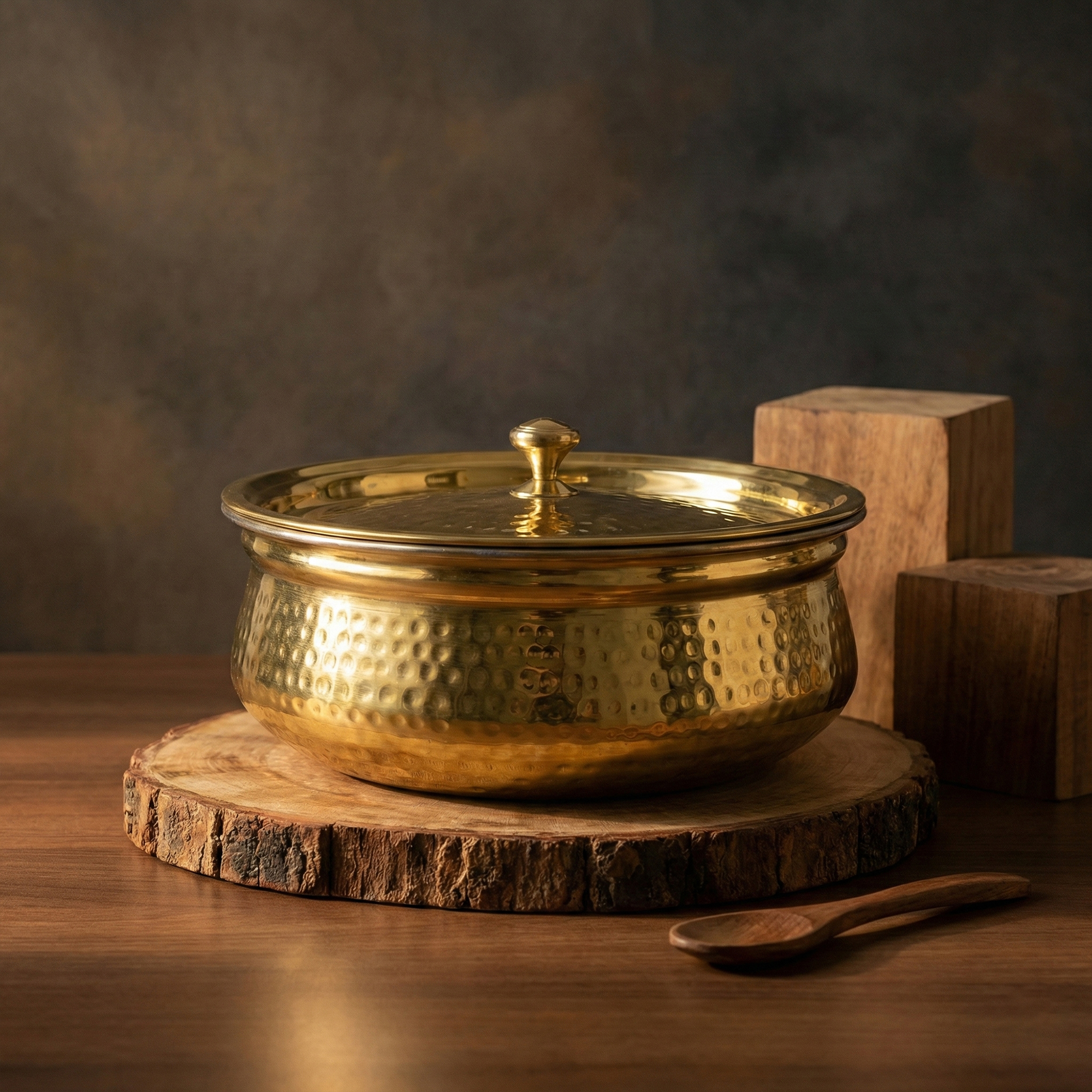 While brass is our core strength, we also offer carefully selected pure wooden kitchenware – from ladles to masala boxes – made without harmful finishes or chemicals.